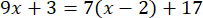 9x + 3 = 7x – 14 + 17
