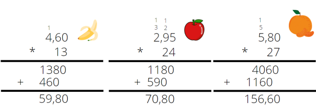 Oblicz, ile zapłacono za każdy poszczególny gatunek. Odczytaj ceny z rysunków. Wagi zakupionych towarów to: 27 kg mandarynek, 13 kg bananów i 24 kg jabłek.