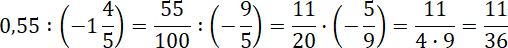 Zapisz liczby jako ułamki zwykłe. Dzielenie zapisz jako mnożenie przez odwrotność dzielnika, skracaj czynniki, gdy to możliwe. Pamiętaj, iloraz liczby dodatniej i ujemnej jest liczbą ujemną.