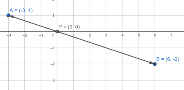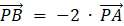 Zauważ, że wektory PA i PB leżą na jednej prostej – mają ten sam kierunek - możesz je powiązać relacją mnożenia; zwroty jednak są przeciwne (mnożenie przez liczbę ujemną); długość wektora PB jest dwa razy większa od wektora PA. Dzięki tym zależnością, możesz zapisać równość PB = -2 • PA.