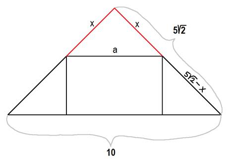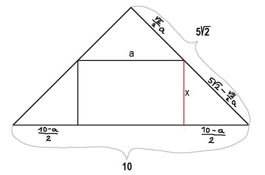 Żeby uzależnić oba wymiary prostokąta od jednego parametru, skorzystaliśmy z własności trójkąta prostokątnego, równoramiennego. Gdy już mieliśmy funkcję pola, znaleźliśmy jej minimum w dziedzinie.