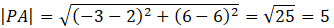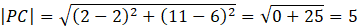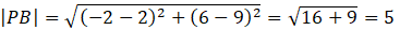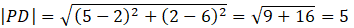 Wyznacz odległość punkt P(2,6) od każdego z punktów A(-3, 6), B(-2, 9), C(2, 11), D(5,2).