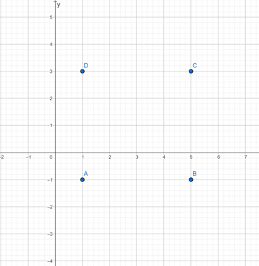 Udowodnij, że czworokąt ABCD, którego wierzchołki to punkty A(1,-1), B(5,-1), C(5,3), D(1,3) posiada środek symetrii – podaj go.