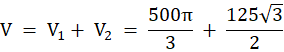 Objętość bryły przedstawionej na rysunku w podręczniku równa jest sumie objętości walca oraz graniastosłupa trójkątnego.