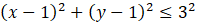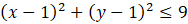 Duże koło ma środek w punkcie (1, 1), a jego promień wynosi 3. Podstawiając te dane do nierówności koła otrzymujesz:
