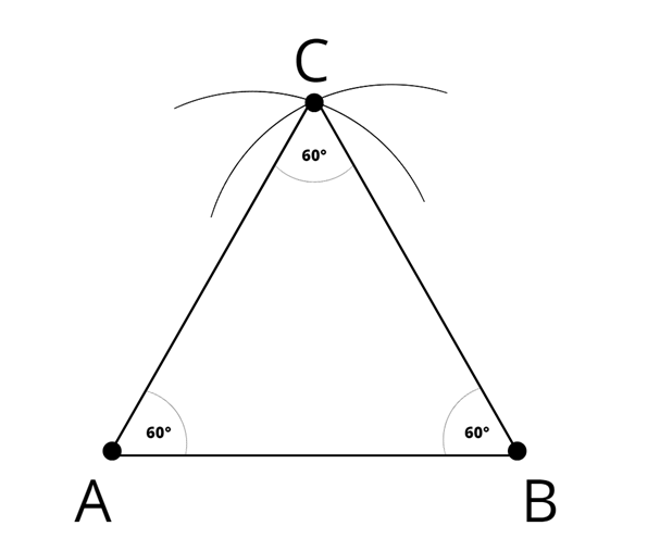 Aby skonstruować trójkąt o mierze 60° skonstruuj trójkąt równoboczny. Zacznij od narysowania odcinka AB, będącego bokiem trójkąta, następnie z punktów A i B zakreśl cyrklem łuki o promieniu AB. Miejsce przecięcia łuków oznacz jako punkt C. Po narysowaniu odcinków AC i BC powstanie trójkąt równoboczny.