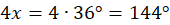 Miary kątów w czworokącie: 36°, 72°, 108°, 144°.