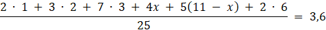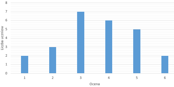 Z diagramu można odczytać, ze osób, które dostały oceny 4 i 5, jest 11. Niech osób, które dostały 4, będzie x, a osób, które dostały 5 będzie 11 – x. Można wtedy zapisać równość: