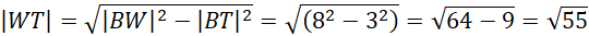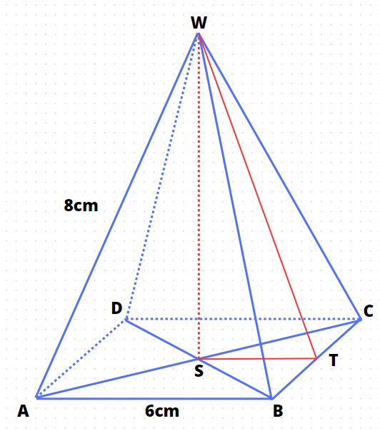 Trójkąt WST zawiera wysokość ściany bocznej ostrosłupa. Obliczyć ją można poprzez twierdzenie Pitagorasa, korzystając ze znanych boków |BW| oraz |BT|, który jest połową boku |BC|.