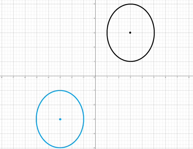 Narysuj w zeszycie dany okrąg, znajdź punkt będący obrazem środka tego okręgu w symetrii względem początku układu współrzędnych i narysuj drugi okrąg.
