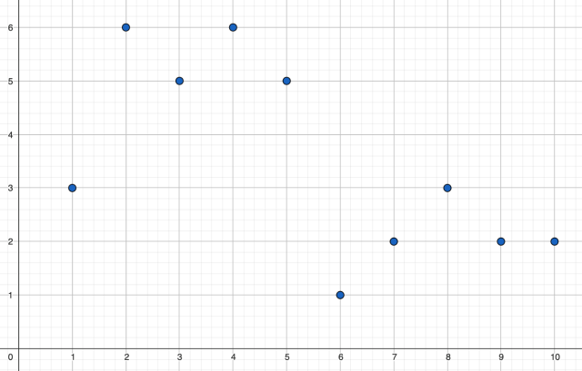 W tym zadaniu musisz, na podstawie wykresu określić, jaki wynik pojawiał się najczęściej, jeżeli funkcja numerowi rzutu przyporządkowano liczbę oczek uzyskanych w tym rzucie. Wiadomo, że wykonano 10 rzutów kostką