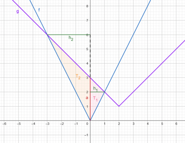 Następnie zaznacz obszar ograniczony powstałym wykresami. Zauważ, że powstały dwa trójkąty. Zaznacz podstawę oraz opadającą na nią wysokość w każdym z nich i oblicz sumę ich pól.