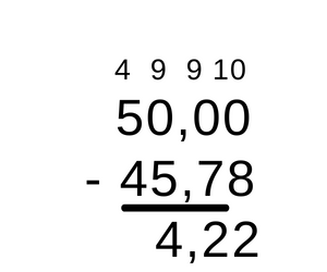 Żeby obliczyć, ile należy dodać od 45,78, by dostać podaną liczbę, należy wykonać odejmowanie. Wykonując odejmowanie pisemne najpierw, należy odjąć cyfry w słupku najbardziej z prawej. Jeśli nie można odjąć cyfr, ponieważ odjemnik jest większy od odjemnej, to należy pożyczyć jedną dziesiątkę ze słupka z lewej strony. Wtedy odjemna w słupku, w którym wykonujemy odejmowanie stanie się o dziesięć większa, a odjemna w kolejnym na lewo słupku zmaleje o jeden. W taki sam sposób należy odejmować każdy kolejny słupek, zaczynając od prawej i idąc do lewej. Pamiętaj, że przecinek wyniku będzie znajdował się pod przecinkami liczb, jakie odejmujesz.
