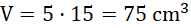 Objętość graniastosłupa obliczysz, mnożąc jego pole podstawy i wysokość bryły. Pole podstawy jest sumą pól trzech figur, z których się ona składa: prostokąta o wymiarach 2 cm x 1,5 cm, trójkąta o podstawie 2 cm i wysokości 0,5 cm i drugiego trójkąta o podstawie 2 cm i wysokości 1,5 cm. Obliczasz pole prostokąta i pola trójkątów, korzystając ze wzorów na te pola, a następnie dodajesz te pola, co daje nam całe pole podstawy bryły. Wysokość graniastosłupa jest podana w dm, zamieniasz ją na cm. 1 dm to 10 cm. Podstawiasz znane już informacje, czyli pole podstawy oraz wysokość graniastosłupa do wzoru na objętość i wykonujesz obliczenia. Objętość bryły wynosi 75