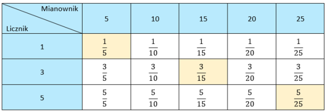 Uzupełnij puste pola tabelki, wzorując się na przykładzie tworzenia ułamka.
