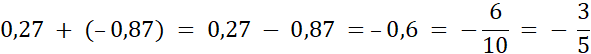 Istnieje wiele rozwiązań np. 0,27 + (–0,87).