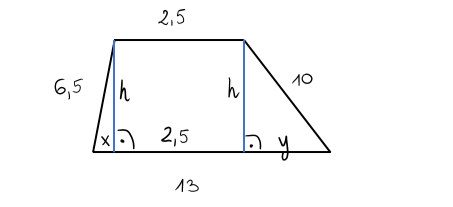 W tym zadaniu musisz obliczyć wysokość trapezu, wiedząc, że podstawy mają długości 13 i 2,5, a ramiona 10 i 6,5.