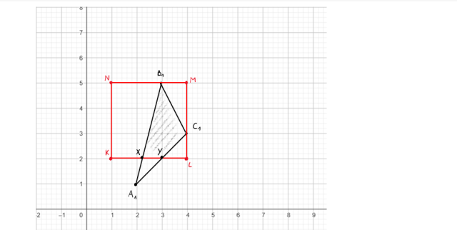 Narysuj daną figurę i oblicz jej pole. Aby to zrobić oblicz pole KLMN i odejmij od niego trzy pola: