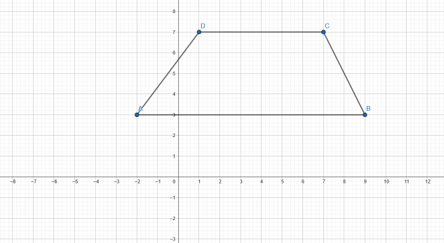 Na początek narysuj rysunek, gdzie zaznacz punkty i połącz je w czworokąt. Otrzymana figura to trapez, więc aby obliczyć jego pole, potrzebujesz długości podstaw oraz wysokość. Odczytaj je z rysunku, wstaw do wzoru i oblicz pole.