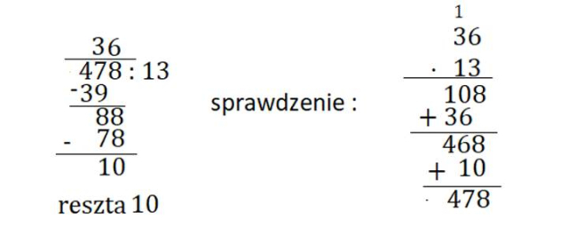 Końcowa liczba z dzielenia, której nie da się już podzielić przez dzielnik, to jego reszta. Sprawdzenie dzielenia z resztą polega na pomnożeniu jego dzielnika (tutaj 13) z jego ilorazem (wynik z dzielenia, tutaj 36). Przy prawidłowo przeprowadzonych obliczeniach w sprawdzeniu suma reszty oraz wyniku z mnożenia powinna być równa dzielnej (tu 478).