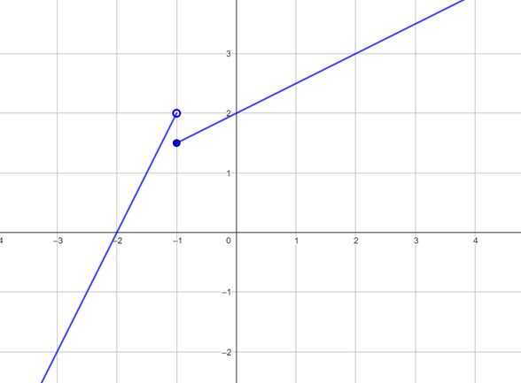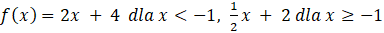 Wzór funkcji zmienia się w zależności od wartości argumentu x, dla argumentów mniejszych od – 1 ma ona wzór f(x) = 2x + 4, a dla argumentów nie mniejszych od – 1 ma wzór f(x) =