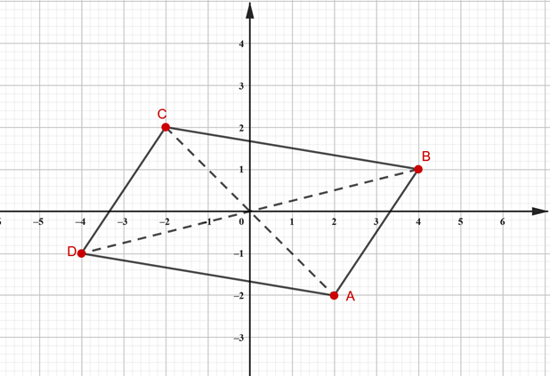 Zauważ, że wierzchołki w punktach A, B, C i D wyznaczają równoległobok, który jest figuro środkowosymetryczną. Środek symetrii jest punktem przecięcia jego przekątnych.