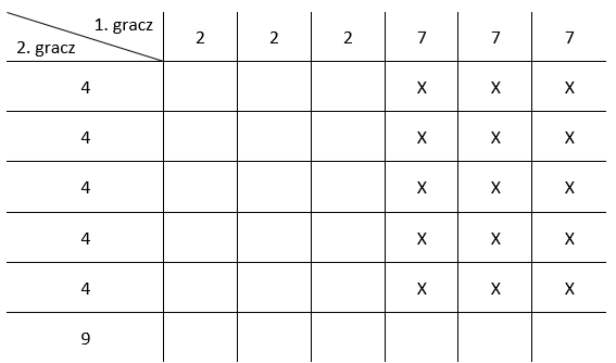 Aby rozwiązać to zadanie musisz rozważyć każdy przypadek. Dla każdego wyboru kostki przez pierwszego gracza musisz rozważyć dwa przypadki wyboru kostek przez gracza drugiego. Jest to trochę czasochłonne, więc aby ułatwić zadanie warto na początku zastanowić się jak skrócić dla każdego przypadku obliczenia. Przede wszystkim dla każdego przypadku będzie przestrzeń zdarzeń elementarnych będzie miała tyle samo elementów. Nie będą to zawsze te same przestrzenie, jednak zawsze będą miały tyle samo elementów, a do obliczania prawdopodobieństwa potrzebna jest ilość elementów zbioru zdarzeń elementarnych. Więc porównując te prawdopodobieństwa, tak naprawdę będziesz porównywał ułamki o mianowniku 36, czyli będziesz porównywał liczniki. A licznikami będą ilości zaznaczonych komórek. Zauważ, że także nie będziesz potrzebował dokładnej wartości tych prawdopodobieństw, a jedynie informację czy jest ono większe od połowy. Oczywiście zdarzeniem losowym w każdym przypadku będzie wyrzucenie większej ilości kostek przez pierwszego gracza. Połowa kratek to 18, więc jeśli zaznaczysz więcej niż 18 kratek, to prawdopodobieństwo wygranej pierwszego gracza jest większe niż drugiego. Ponieważ wymagane jest, aby w obu przypadka szansa na wygraną pierwszego gracza była większa, to gdy tylko w jednym przypadku okaże się, że ta szansa jest mniejsza, to możesz odrzucić daną kostkę. Warto zauważyć jeszcze, że w przypadku wybrania kostki B przez pierwszego gracza i kostki A przez drugiego, tabela wygląda analogicznie jak w przypadku wybrania przez pierwszego gracza kostki A, a przez drugiego – B. Okazuje się, że wystarczy narysować 3 tabele.