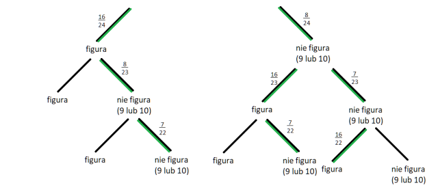 Ponieważ doświadczenie losowe jest wieloetapowe, w tym zadaniu musisz narysować drzewko. Każdy poziom drzewka będzie odpowiadał kolejnemu losowaniu. Możesz wylosować albo figurę, albo kartę, która nie jest figurą (czyli 9 i 10) i te przypadki zaznaczasz jako gałęzie. Wylosowanie drugiej figury na którymkolwiek etapie powoduje niespełnienie zdarzenia losowego, więc nie musisz rysować gałęzi, które wychodzą od drugich figur. Prawdopodobieństwo wylosowania danej karty obliczysz korzystając z klasycznej definicji prawdopodobieństwa, dzieląc ilość danych kart przez wszystkie karty. Pamiętaj, że gdy wylosujesz jedną kartę, ich ilość zmniejsza się o tę wylosowaną kartę. Gdy już narysujesz drzewo zaznacz te zdarzenia, których prawdopodobieństwo będziesz liczył oraz wszystkie gałęzie po drodze. Następnie przemnóż przez siebie prawdopodobieństwa na poszczególnych gałęziach oraz dodaj do siebie uzyskane wyniki z różnych gałęzi.