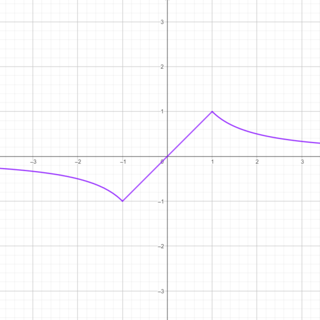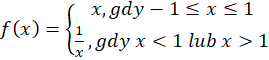 Zacznij od narysowania wykresu funkcji , zwróć uwagę, że istnieje ona dla x większych lub równych -1 i mniejszych lub równych 1. Następnie narysuj wykres dla argumentów mniejszych od -1 lub większych od 1. Na podstawie wykresu wyznacz dziedzinę i zbiór wartości. Zauważ, że funkcja istnieje dla x należących do zbioru liczb rzeczywistych, a zbiór wartości to przedział .