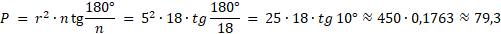 Oblicz pole 18-kąta foremnego opisanego na okręgu o promieniu 5.