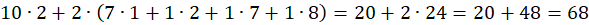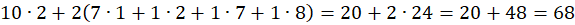 Zwróć uwagę, że graniastosłup składa się z dwóch warstw, a każda z nich zbudowana jest z 24 sześcianów, zatem wszystkie krawędzie boczne mają długość 2. W podstawie możemy wyróżnić 7 krawędzi długości 1, jedną długości 2, jedną długości 7 oraz jedną długości 8: