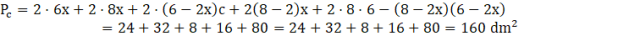 Objętość kwadratowego pierścienia opisuje suma pól czterech mniejszych prostopadłościanów. Przyrównujemy równanie opisujące tę objętość ze względu na wartość zmiennej x do wartości 80, która ma być równa wartości objętości. Rozwiązujemy równanie wielomianowe dowolnie znaną metodą, sprawdzamy, czy rozwiązania zawierają się w przedziale dziedziny funkcji objętości.