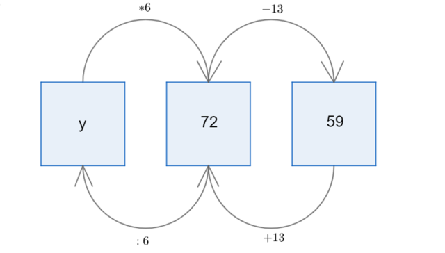 Pamiętaj, działaniem odwrotnym do dodawania jest odejmowanie, a do mnożenia – dzielenie. Zapisz równość za pomocą działań umieszczonych na strzałkach na górze. Aby powrócić do wartości y, wykonuj działania odwrotne, w odwrotnej kolejności, w jakiej były wykonywane wcześniej. Do liczby 59 dodaj 13, a wynik podziel przez 6 – tyle wynosi y.