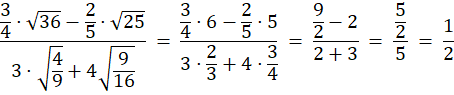 Upraszczaj po kolei wyrażenie – najpierw oblicz wartości pierwiastków, później oblicz wartość licznika i mianownika oraz całego ułamka.