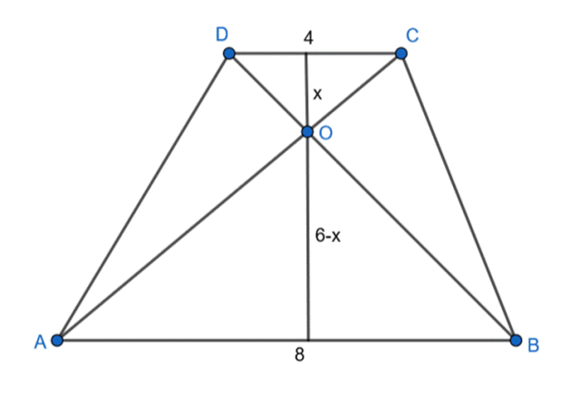 Wyznacz pola trójkątów ABO i CDO przedstawionych na rysunku oraz ustal jaka jest odległość punkt O od krótszej podstawy, jeśli wysokość trapezu wynosi 6 cm, a długości podstaw są równe odpowiednio 4 cm i 8 cm.
