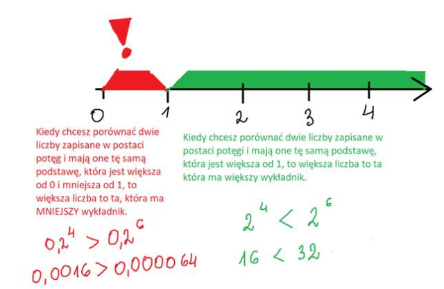 Kiedy obie liczby będą miały tę samą podstawę, będzie je łatwiej porównać – większa będzie ta, która ma MNIEJSZY wykładnik. W poprzednich przykładach większa była ta o większym wykładniku, ale tutaj rozważamy ułamki. Im więcej razy pomnożysz ułamek dziesiętny przez siebie, tym mniejszy będzie wynik
