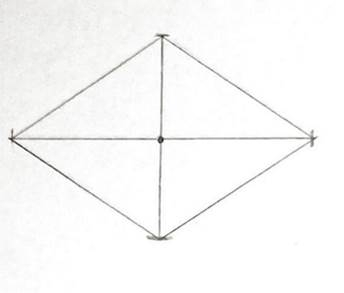 W pierwszej kolejności narysuj romb oraz jego przekątne, a następnie zaznacz punkt przecięcia tych przekątnych. Względem tego punktu figury będą symetryczne. Dla każdego z wierzchołków narysuj prostą przechodzącą przez ten wierzchołek i zaznaczony punkt. Na każdej z prostych odmierz odległość między punktem a wierzchołkiem i zakreśl łuk o takim promieniu tak, by punkt, względem którego figury będą symetryczne znajdował się pośrodku pozostałych. Połącz otrzymane punkty w romb. Zauważ, że dwie figury pokrywają się ze sobą.