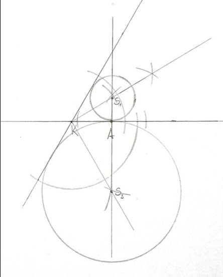 , dla których wspólnym ramieniem jest półprosta, na której leży punkt A. Oznacz punkty przecięcia dwusiecznych z symetralną odcinka jako S1 i S2. Na koniec zakreśl okręgi o środkach w punktach S1 i S2 i promieniu kolejno AS1 i AS2.