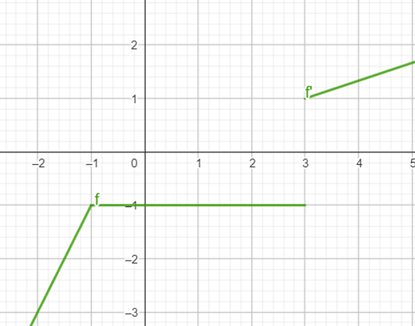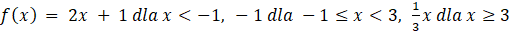 Wzór funkcji zmienia się w zależności od wartości argumentu x, dla argumentów mniejszych od – 1 ma ona wzór f(x) = 2x + 1, dla argumentów nie mniejszych od – 1, ale mniejszych od 3 jest stała i wynosi – 1, dla argumentów nie mniejszych od 3 ma ona wzór f(x) =