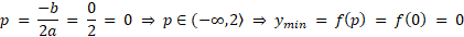 Określamy współczynnik a – jest dodatni, więc ramiona są skierowane w górę oraz p i sprawdzamy, czy należy on do przedziału. Tutaj należy, więc wartość najmniejsza jest osiągana przez argument p. Zauważamy, że przedział nie jest domknięty, więc wartość największa nie jest osiągana przez funkcję.