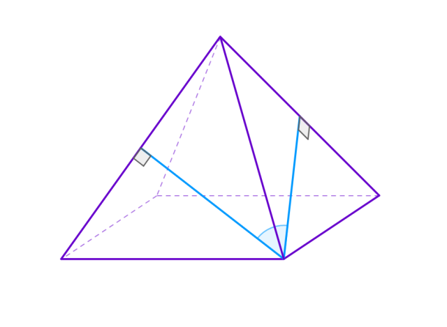 Naszkicuj kąt w ostrosłupie prawidłowym czworokątnym zawarty między wysokościami sąsiednich ścian. Wysokości są opuszczone na przeciwległe krawędzie boczne.