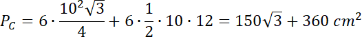 Wyznacz pole powierzchni całkowitej tego ostrosłupa, jeśli wiadomo, że jego podstawą jest sześciokąt oraz krawędzie podstawy ostrosłupa prawidłowego mają długość 10 cm, a krawędzie boczne – 13 cm.