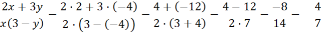 Wstaw dane podane w zadaniu. Wykonaj mnożenie w liczniku i mianowniku. Następnie wykonaj dodawanie i odejmowanie. Pamiętaj, że możesz zmienić dodawanie na odejmowanie, tylko wtedy, gdy zmienisz znak drugiej liczby na przeciwny. Na koniec podziel liczbę w liczniku przez liczbę w mianowniku. Nie zapomnij, iloraz liczby dodatniej i ujemnej jest liczbą ujemną.