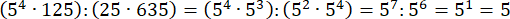 Najpierw zapisz każdą liczbę w postaci potęgi o podstawie 5 i zgodnie z kolejnością wykonywania działań zacznij od działań w nawiasach. Wykorzystaj wzory na mnożenie i dzielenie potęg o takich samych podstawach:
