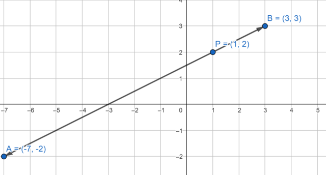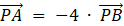 Zauważ, że wektory PA i PB leżą na jednej prostej – mają ten sam kierunek (możesz je powiązać relacją mnożenia); zwroty są przeciwne (mnożenie przez liczbę ujemną); długość wektora PA jest dwa równa czterokrotności długości PB. Dzięki tym zależnością, możesz zapisać równość PA = -4 • PB.
