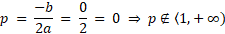 Określamy współczynnik a – jest dodatni, więc ramiona są skierowane w górę oraz p i sprawdzamy, czy należy on do przedziału. Tutaj nie należy, więc wartość najmniejsza nie jest osiągana przez argument p. Zauważamy, że przedział nie jest domknięty, więc wartość największa nie jest osiągana przez funkcję.