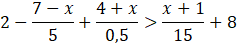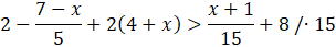 Aby wyznaczyć x z tej nierówności musisz wymnożyć obie strony nierówności przez najmniejszą wspólną wielokrotność wszystkich mianowników (∙15). W kolejnym kroku uprościć wyrażenie po obu stronach (wymnażając nawiasy przez liczbę, stojącą przed nimi) i przenieść wszystkie niewiadome na jedną stronę. Następnie musisz odjąć stronami liczbę niestojącą przy x (-129) i podzielić obie strony równania przez liczbę stojącą przy niewiadomej (:32).