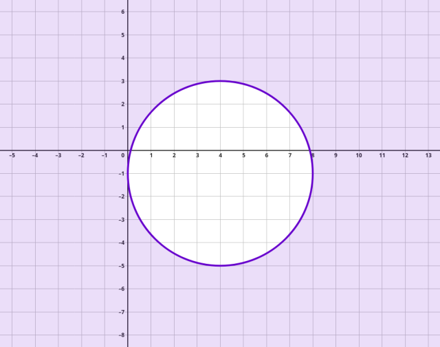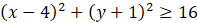 Zbiór zawiera wszystkie punkty dalsze lub równe w odległości do punktu (4,-1) od okręgu o środku w punkcie (4,-1) oraz promieniu 4.