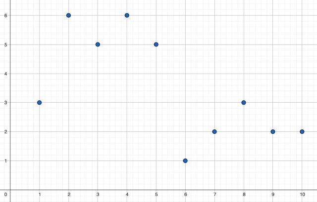 W tym zadaniu musisz, na podstawie wykresu określić jaka jest średnia uzyskanych wyników rzutów kostką do gry, jeżeli funkcja numerowi rzutu przyporządkowano liczbę oczek uzyskanych w tym rzucie. Wiadomo, że wykonano 10 rzutów kostką