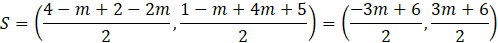 Wyznacz wartości m, dla których S(3, 3-m) jest środkiem odcinka AB o końcach w punkcie A(4-m, 1-m), B(2-2m, 4m+5).